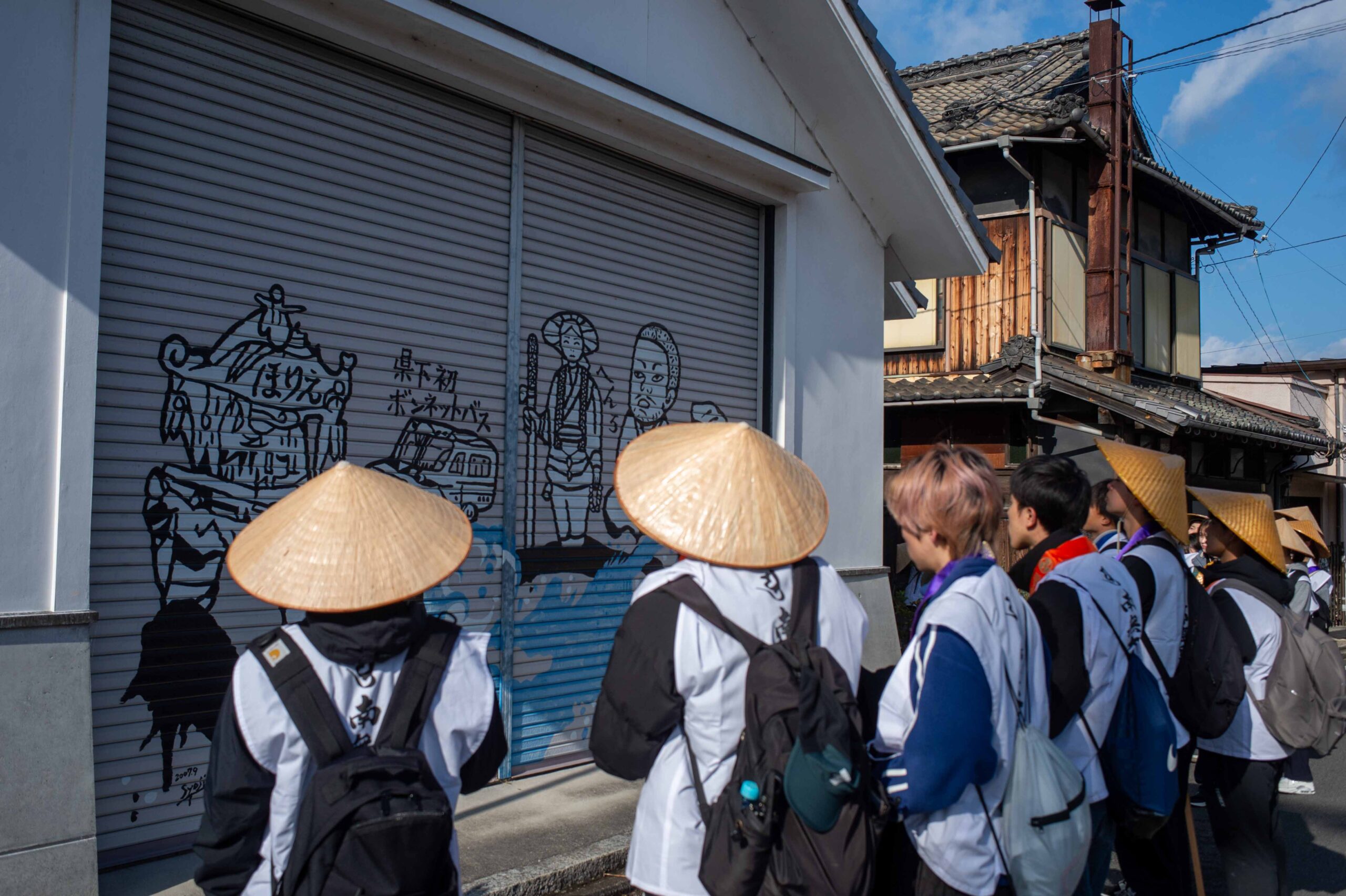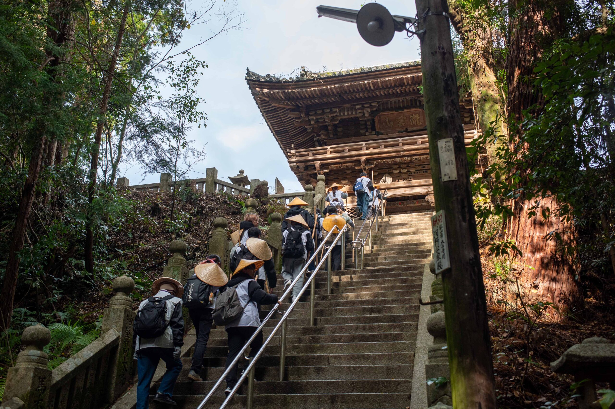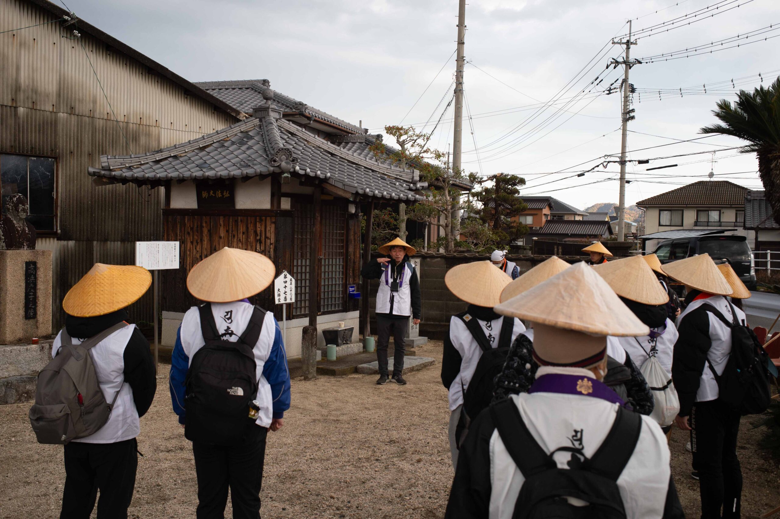 今年度は大本敬久准教授(地域協働推進機構)にご案内いただき、松山市北条の西ノ下大師堂から逆打ちで粟井坂大師堂、堀江駅前毘沙門堂、53番札所円明寺、52番札所太山寺をめぐり、愛媛大学城北キャンパスまでの約24キロを歩きました。